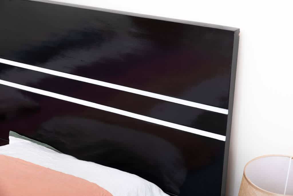 A Black finish King size bed with White strips, built with simple geometric shapes to give a sophisticated look to your room..